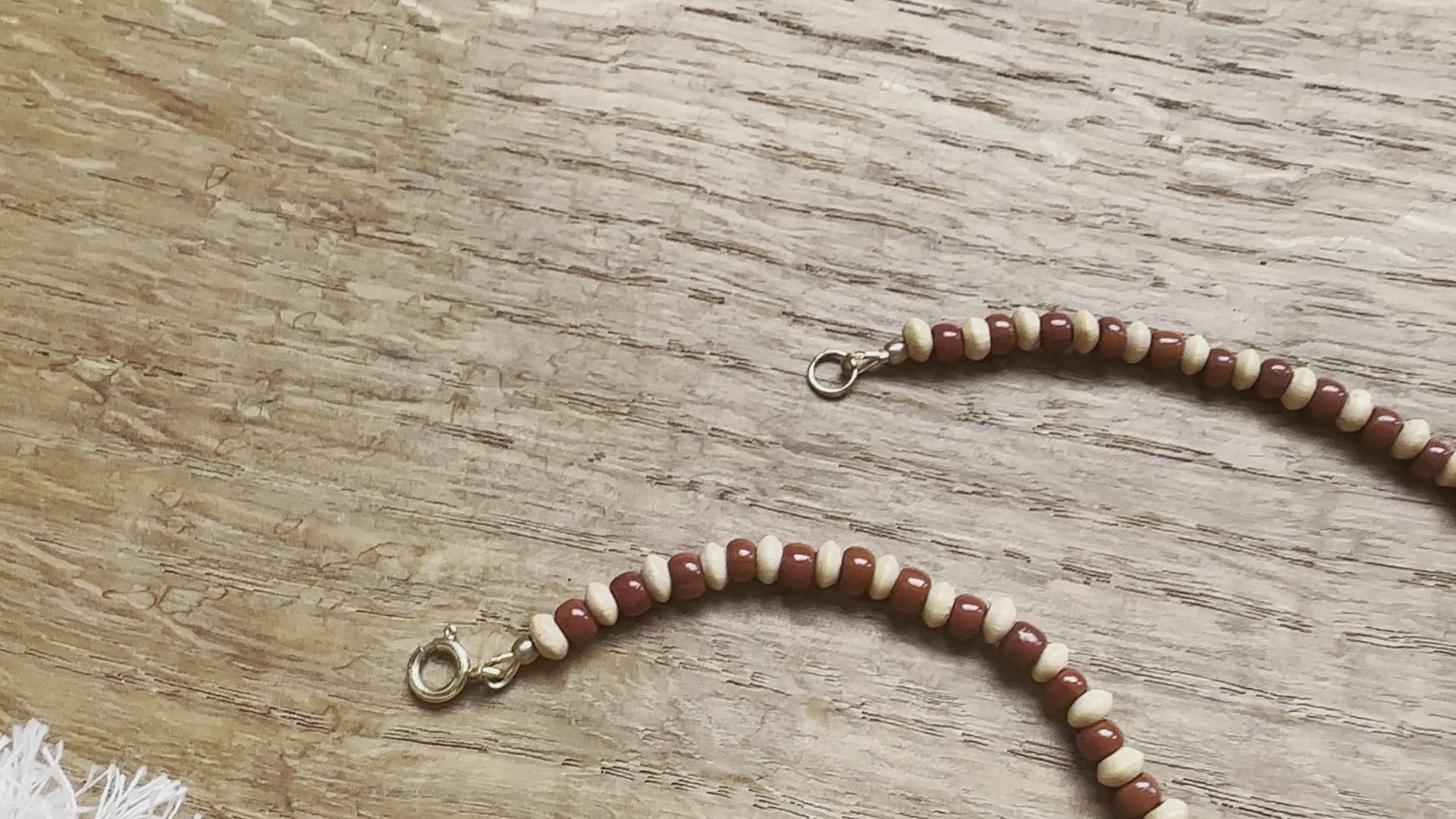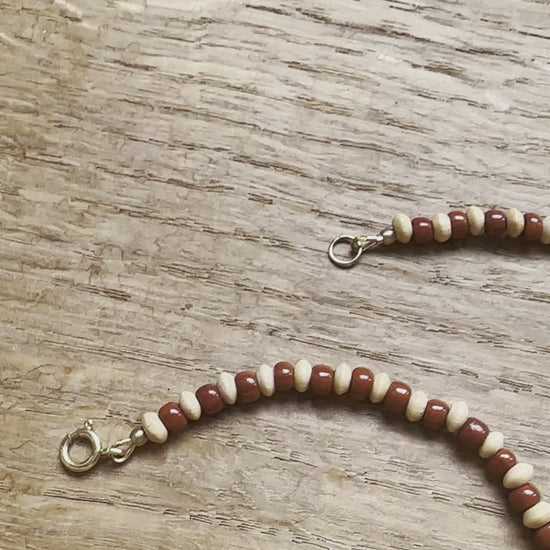 aus natürlichen, beigen Holzperlen und Glasperlen im warmen Rotton. Details und Anhänger aus Messing, Verschluss aus hochwertigen Goldfilled (langlebiger und hochwertiger als einfache, dünne Vergoldung). Der Boho und Ethno Stil passt zu vielen Oufits, egal zu welcher Jahreszeit.