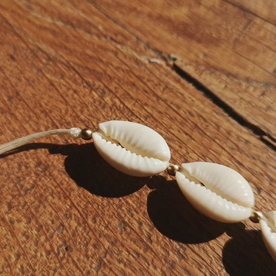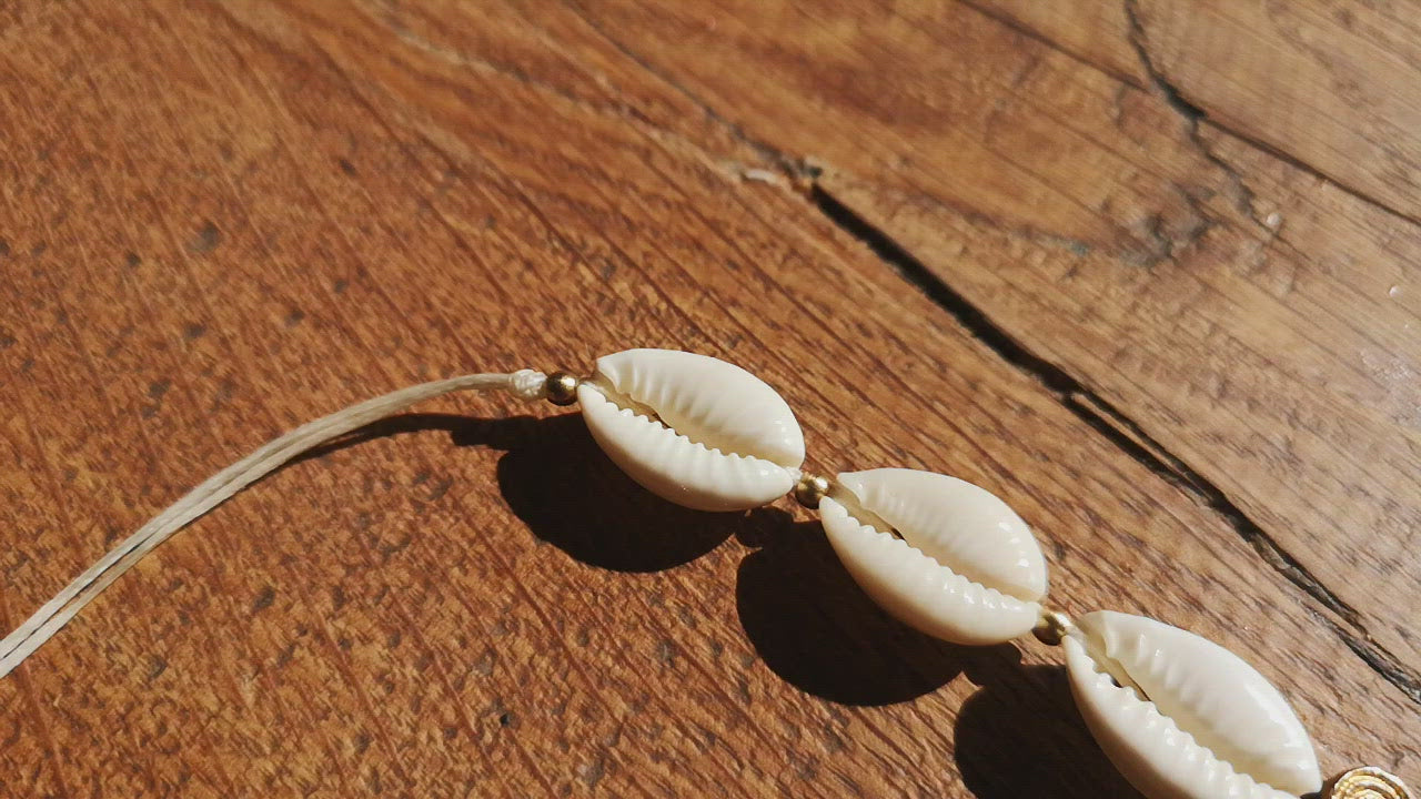 Der goldene Kauri-Anhänger dieser Choker-Kette macht die weiße Boho-Halskette zu einem eleganten Schmuckstück für sie und ihn, perfekt für den Strandurlaub.