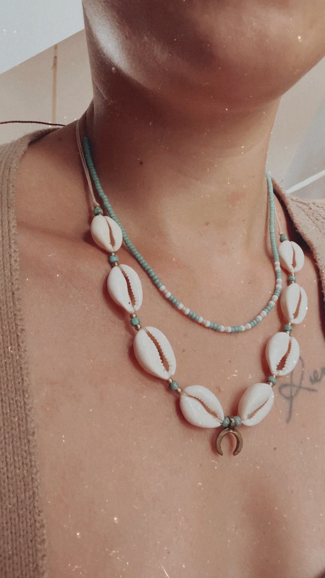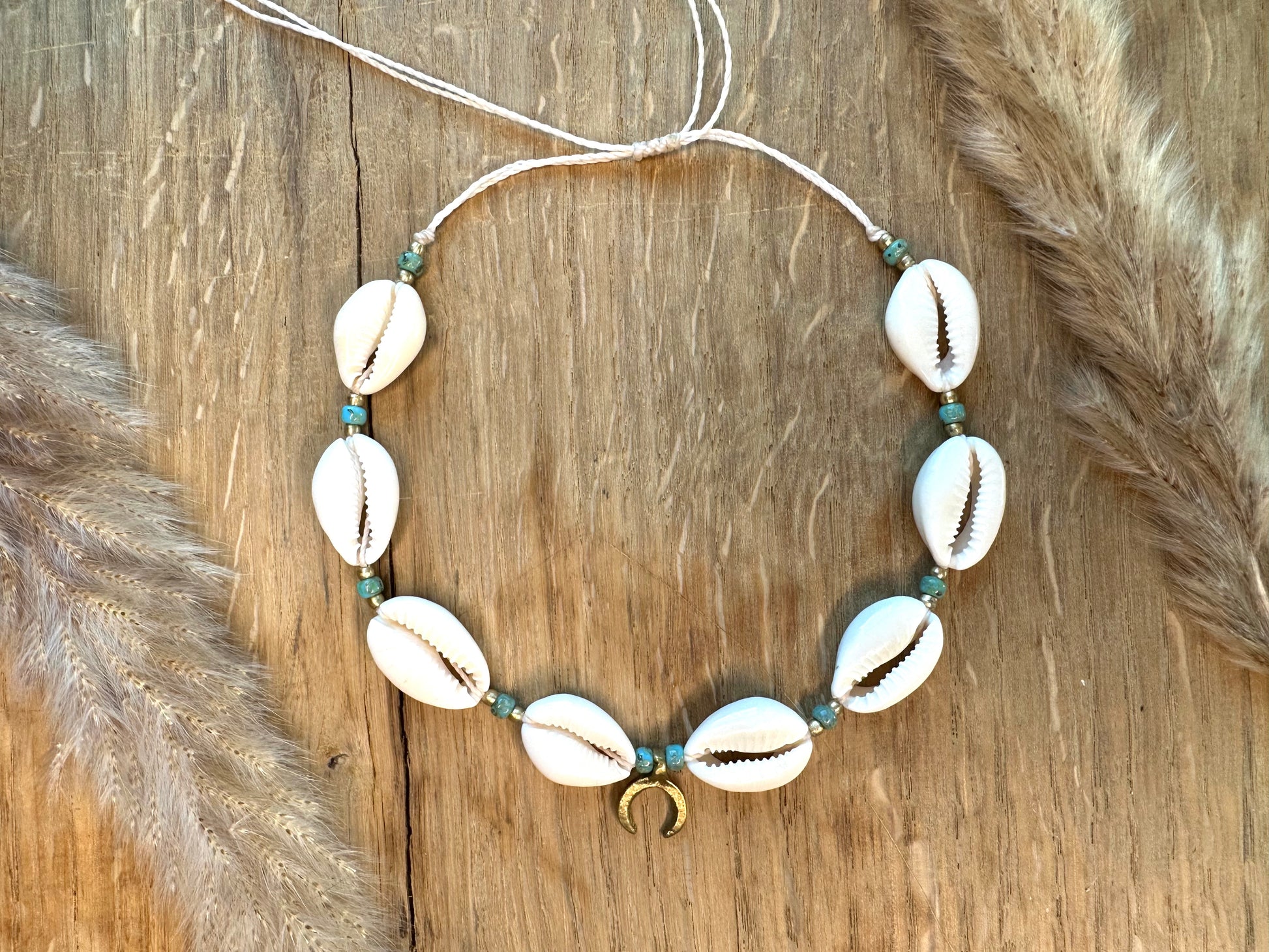 Diese verspielte Muschelkette mit Halbmondanhänger und wunderschönen türkisfarbenen Perlen passt perfekt zu Boho-Outfits, aber wertet auch schlichte Looks mit Pulli/Shirt und Jeans super auf. Hippie Style der happy macht!