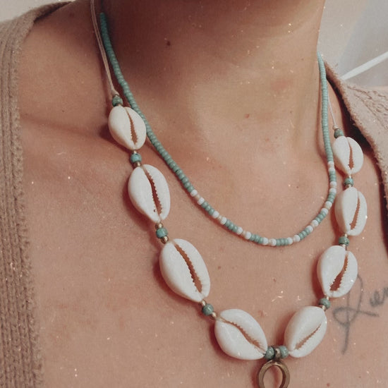 mit Kaurischnecken, Perlen und Messinganhänger/Perlen. Surfer - Boho Schmuck.